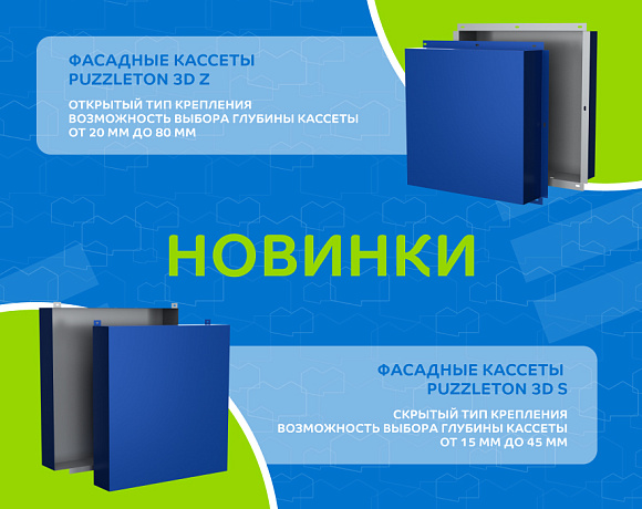 Мы серийно вводим в ассортимент два вида кассет 3D - Puzzleton 3D Z - с максимальным эффектом объема благодаря выбору глубины кассеты от 20 до 80 мм и Puzzleton 3D S - эстетичные кассеты с возможностью выбора глубины от 15 до 45 мм, скрытым скреплением и минимальным рустом всего 2-5 мм, что особенно важно для нижних этажей зданий.